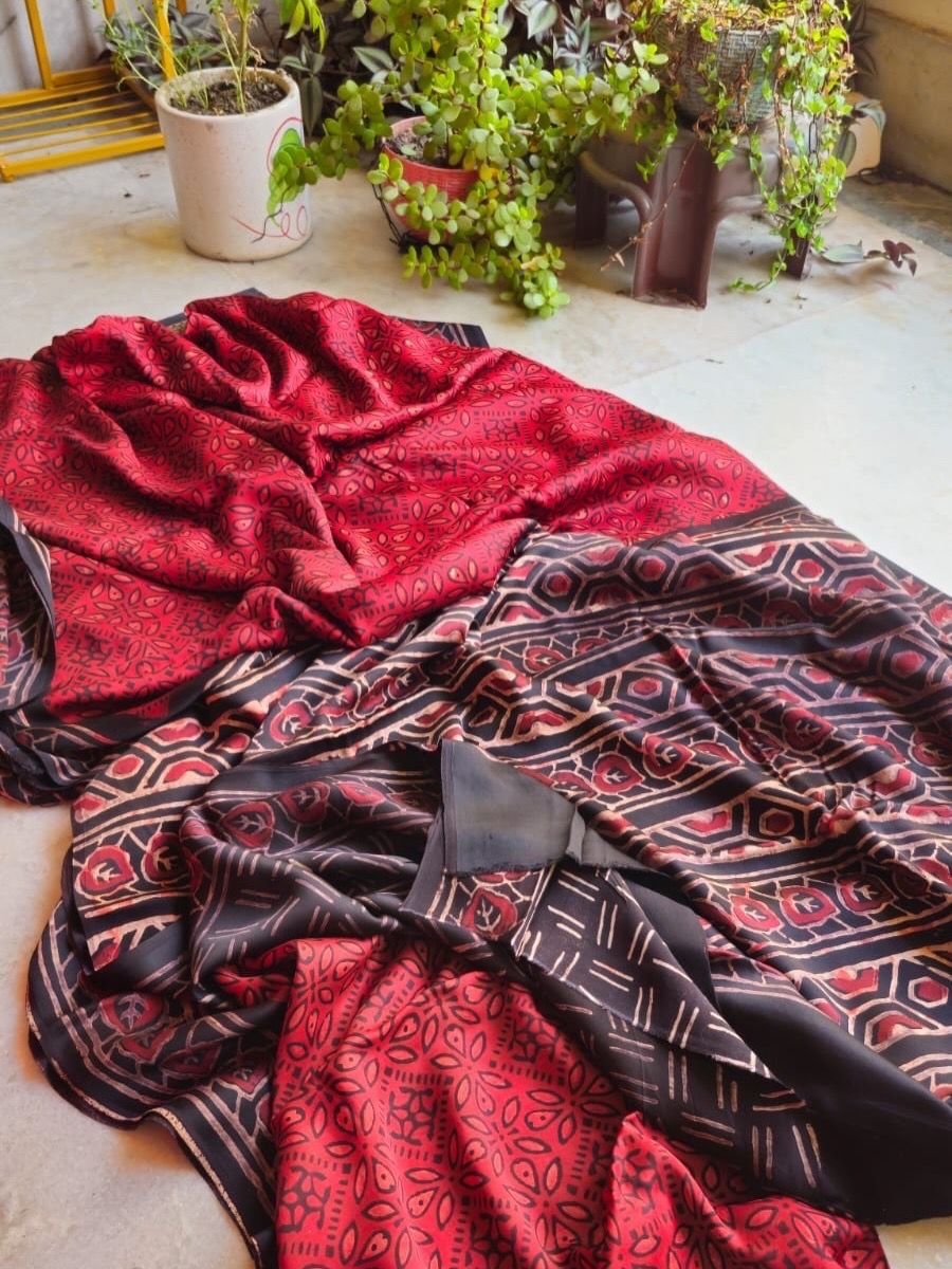 Hand Block Natural Ajrak On Pure Modal Silk Saree
