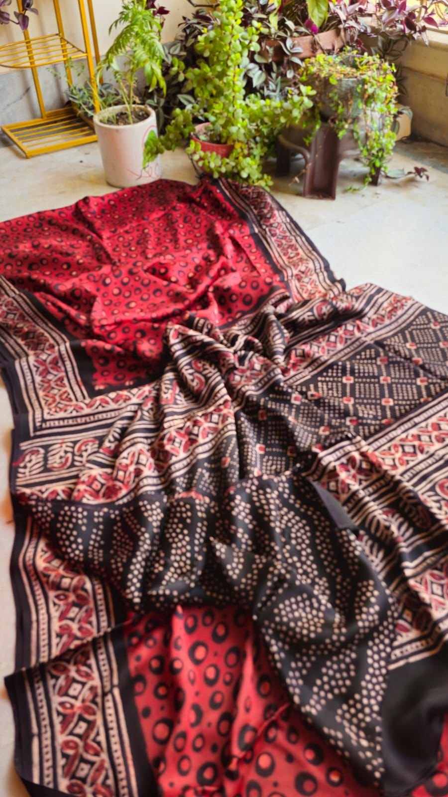 Discover the mesmerizing charm of hand block natural Ajrak printing on pure Modal silk saree—a perfect blend of traditional artistry and modern elegance. Each saree is meticulously crafted by skilled artisans, ensuring a piece of heritage wrapped in luxury. With its smooth texture and intricate design, this saree is a celebration of grace and sophistication suitable for any occasion.