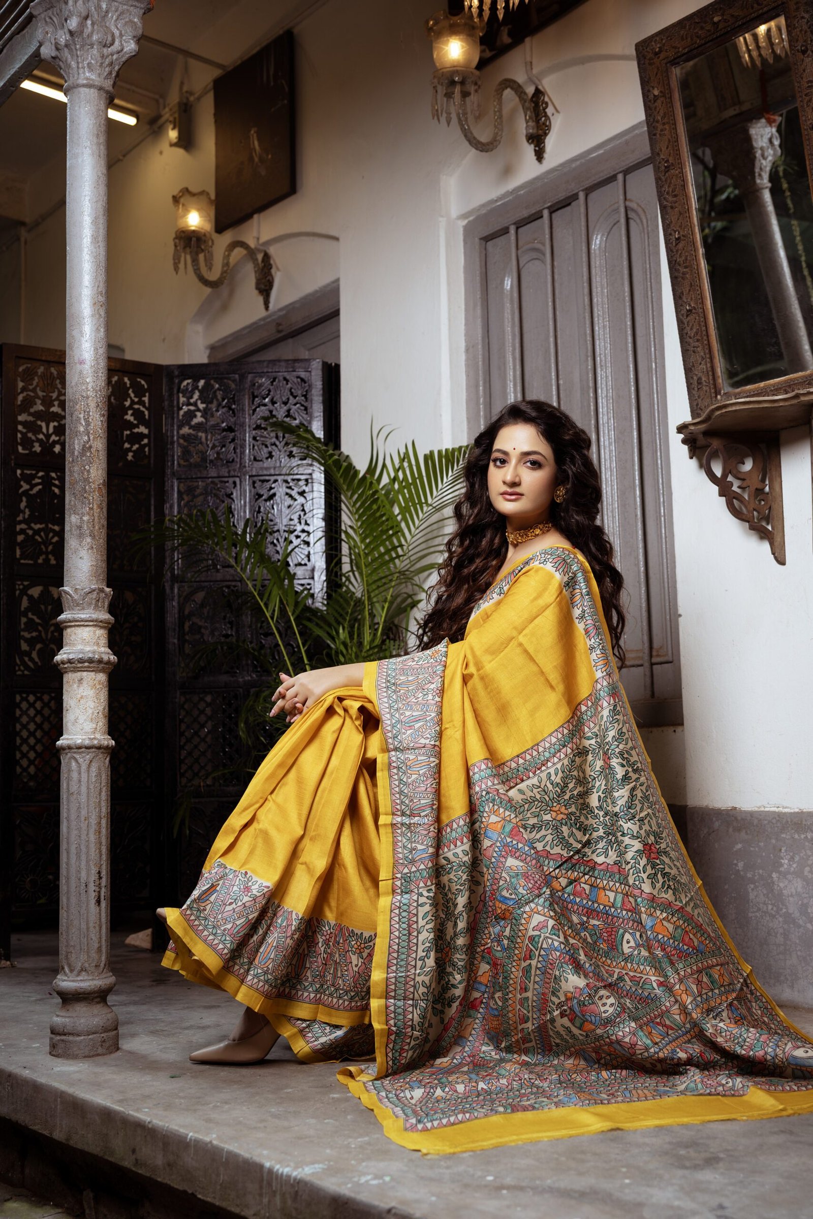 Hand-painted by skilled artisans, each saree encapsulates intricate designs inspired by nature and mythology. The pure tussar silk base ensures unmatched durability and comfort, while the vibrant colors of Madhubani art showcase a true homage to traditional Indian heritage.